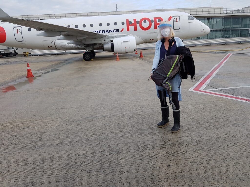 Nu äntligen sitter vi på planet, fullbokat. På vägen till Paris fick vi fylla i ett papper om vart vi skulle och vart vi suttit i planet osv. När vi steg på planet i Paris tog dom febern på oss. Även detta plan var helt fullt. Fick åka flygbuss från planet till terminalen, satt på varandra…………då fällde vi ner visiret över munskyddet………………lite läskigt med allt folk så nära tyckte vi.
