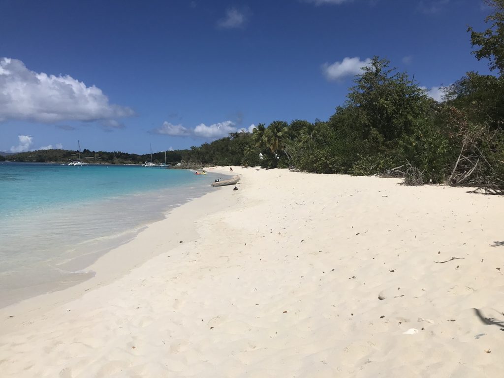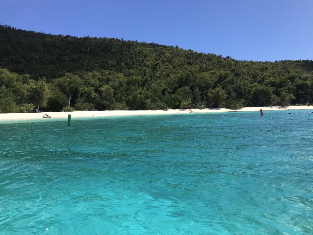 Var skönt lämna stadslivet och komma ut på havet igen, var inte långt alls. Seglade till västsidan och följde den norrut. Hittade en ledig boj som vi tog. Det är en nationalpark och ankringsförbud. Finns nog bara 2 vikar man får ankra i runt hela St John. Kostar egentligen 26 USD per natt men nu är nationalparken stängd och inga avgifter tas ut. Var fullt med båtar på alla bojarna. Fina vita stränder överallt.