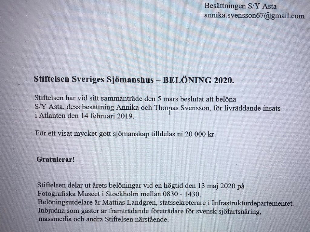 Vi fick ett mail ifrån stiftelsen när vi var i Puerto Rico. Kanslichefen hade pratat med vår vän Bill som meddelade vi var i PR. En journalist skulle intervjua oss. Vi gjorde upp en tid med journalisten och körde intervjun över facetime. Allt gick bra och härom veckan fick vi detta fina besked. Känner oss väldigt glada och det bästa av allt var ju att det gick så bra. Kan i samma veva berätta om våra franska vänner. Dom jobbar och står i på Martinique och samlar pengar till en ny båt. Ev hade dom en ide om att komma till Sverige i sommar och leta båt. Men just nu kanske det inte är aktuellt.
